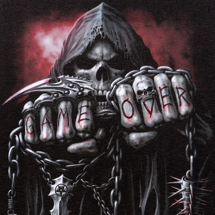 This dark and edgy canvas plaque features licensed artwork from Spiral Direct. 'Game Over' depicts the Grim Reaper with 'game over' carved into his ghostly knuckles and will elevate any gothic decor. 19x25cm.