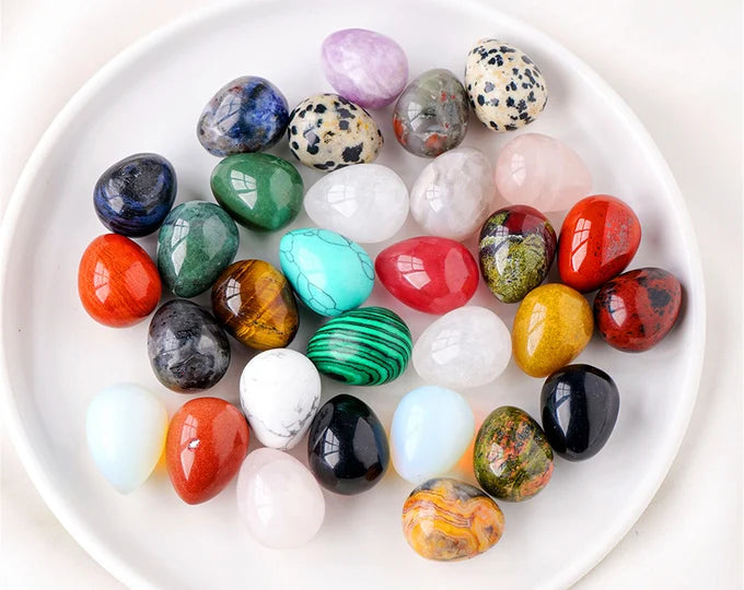 Measuring approximately 2cm in height and 1.5cm in width, these mini crystal eggs are perfectly sized to fit in the palm of your hand. Carved from high-quality crystals, each egg displays its own mesmerizing colours, patterns, and energies, making every piece a truly one-of-a-kind gem. Whether it's the translucent clarity of quartz, the calming hues of rose quartz, or the grounding earth tones of jasper, these mini crystal eggs are a testament to the natural beauty and diversity of the mineral kingdom.