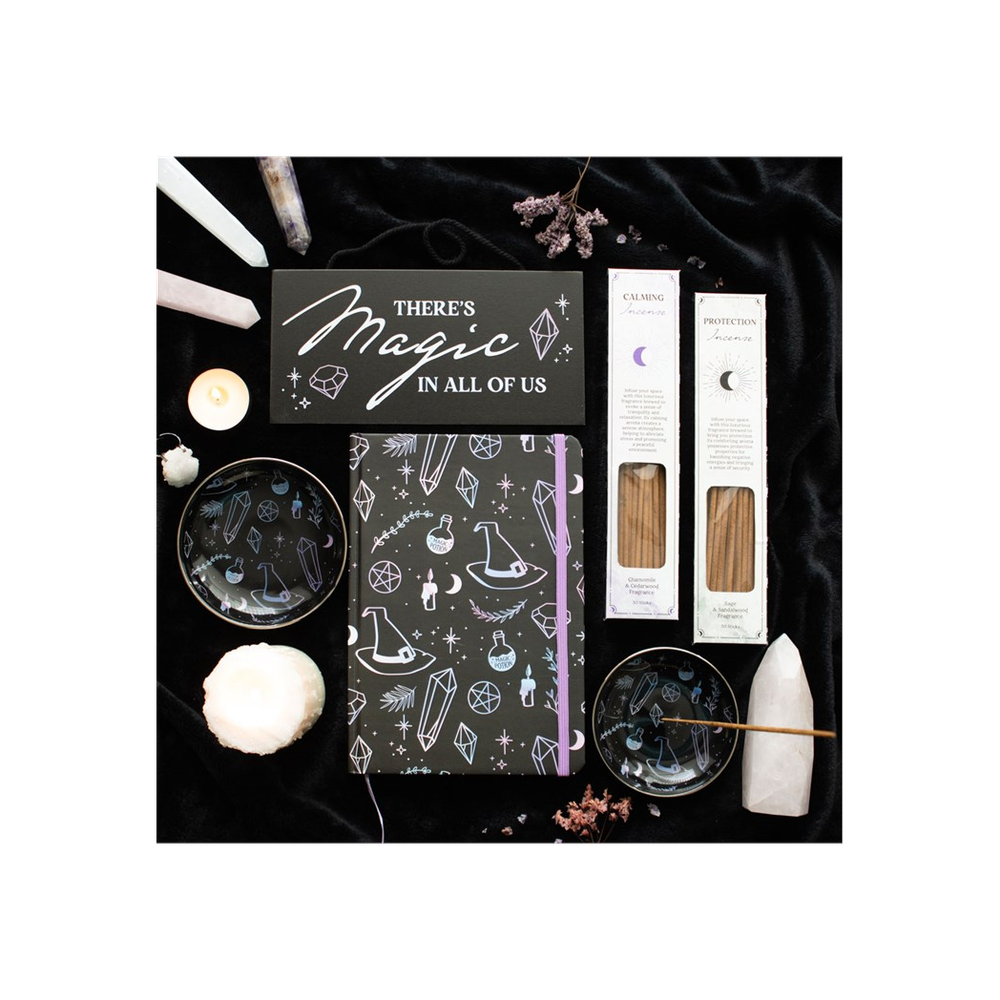 Whether used for notes, lists, or journaling, this beautiful A5 notebook will elevate your desktop with a mystical, holographic design of crystals, witch hats and potions. Perfect for a crystal collector or for anyone in touch with their witchy side, this notebook is accented by silver foil pages and a lilac ribbon marker. Includes 100 sheets / 200 lined pages.