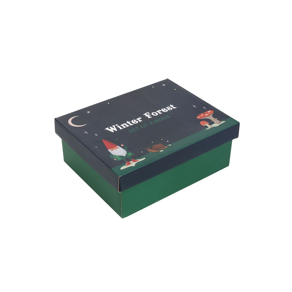 This set of four mugs is perfect for anyone who wants to fill their home with practical yet distinctive pieces which bring joy when used. Featuring a different design inspired by a winter forest, including a snail, toadstools, a mushroom house and a gnome, each accented with moon and star details adding a touch of celestial wonder. Presented in a matching box, this set of navy-blue mugs makes a perfect gift. 350ml capacity. Dishwasher and microwave safe.